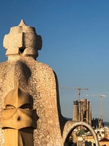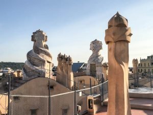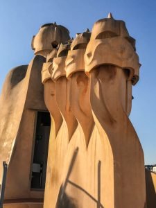 I probably should have done some stair-climbing training ahead of this visit: the eight (8) stories were not easy to conquer via a narrow, airless staircase with a mask on (!) and no handy clues as to how much longer this agony was going to last. Yeah, I’m not keen on lots of stairs but I did manage to make it to the top and what a top it is! I’m sure most of you have seen pictures of that amazing rooftop terrace: the soldier-like chimneys and air vents and undulating walkways. There are little steps everywhere and since I was a little oxygen-deprived after my climb, I have to say I didn’t feel all that stable up there. Holding my phone up to take pictures took all the concentration I had and I was petrified I’d drop the damn thing at any moment. Then I walked over to a part of the terrace where I was served a lovely chilled glass of cava (that’s Spanish sparkling wine, if you didn’t know). Imagine how steady I was after that! 🙂