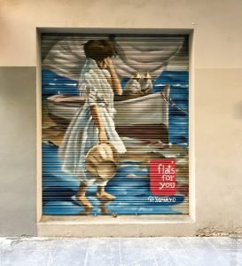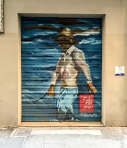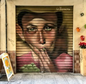 Well, there aren’t really any city walls left, if by “city walls” you mean the ancient ones. There is no graffiti on the two remaining city gates (Torres dels Serrans or Torres de Quart), thank goodness. The historical buildings are usually spared the spray paint, though regular walls of many buildings are, sadly, not. The more run down or abandoned-looking a building is, the more graffiti it wears, unfortunately. This may also be a reason why so many walls and shutters are painted with nice designs: graffiti “artists” typically honour the real artists and do not tag their work.