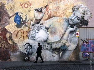 One does not need to leave València to see murals … as a matter of fact, if you count the regular graffiti, this city is covered in spray paint. Unfortunately, a lot of it is just regular crappy graffiti but there is much art here as well. As I walk around Ciutat Vella I come across new pieces all the time. They’re not all murals though. Quite often the shutters of the various shops or restaurants hide their art so unless you walk down a specific street at a specific time, it is very easy to miss them. This unpredictability makes for a wonderful surprise. I was lucky on this one day in early January and spotted a bunch I had not noticed before. (Some of the photos are from earlier escapades.)