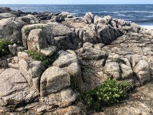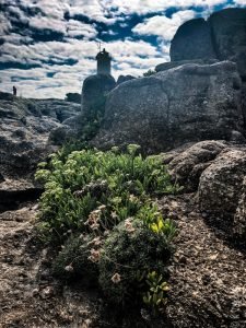 But we were not done with amazing views just yet; we may have been able to go visit the lighthouse at Finisterre, but this didn’t mean we couldn’t enjoy one near-by. Faro do Roncudo stands guiding ships skirting the Iberian Peninsula on the way to the Bay of Biscay. The only problem is, the waters around here are so treacherous, the whole area is called the Costa da Morte (Coast of Death), and there have been countless lives lost over the centuries on these rocky shores. No wonder the Romans feared going beyond and thought this the end of the world. You don’t have to be an ancient Roman to appreciate the vastness of the Atlantic to the west nor the furious crashing waves of the ragged Galician coast. The lighthouse of Roncudo stands alone on an outcropping, surrounded by hills to the east, but offers a great view of much of the shore to the south. I made my way down the rocks to just sit down and take it all in: the massive boulders, the waves crashing into them, the constant wind, the incredible variety of flora somehow clinging to life in such an inhospitable place. All I could think was that I really, really, really wanted to spend a lot of time in a place like this just staring at the waves. There is something magical about it and if I ever win the lottery, I am going to buy (build?) a little house with a view to a rocky shore where crashing waves can put me into a trance like the one I experienced today. In Galicia, of course. It was very difficult to leave but the others wouldn’t do so without me so I tore myself away, took a closer look at the lighthouse and the Cruces do Cabo, crosses placed among the rocks to the south commemorating those souls lost in these wicked waters.